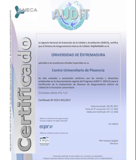 El pasado día 15/11/2024 recibimos el informe final del programa AUDIT así como el certificado de la Agencia Nacional de Evaluación de la Calidad y la Acreditación (ANECA) del Centro Universitario de Plasencia.